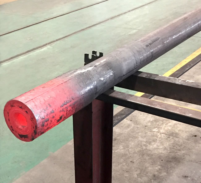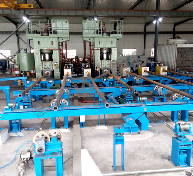 管端加厚機是我公司針對石油鉆桿、油管的加厚工藝研發(fā)的新型特種設備,管端加厚的目的主要是為了保證鋼管在管端車加工截面處的強度,鋼管加厚類型有外加厚、內(nèi)加厚、內(nèi)外加厚三種工藝。加厚機組有加厚機、輔機及加熱系統(tǒng)等組成,即對鋼管進行橫向運輸、加熱及端部加厚。